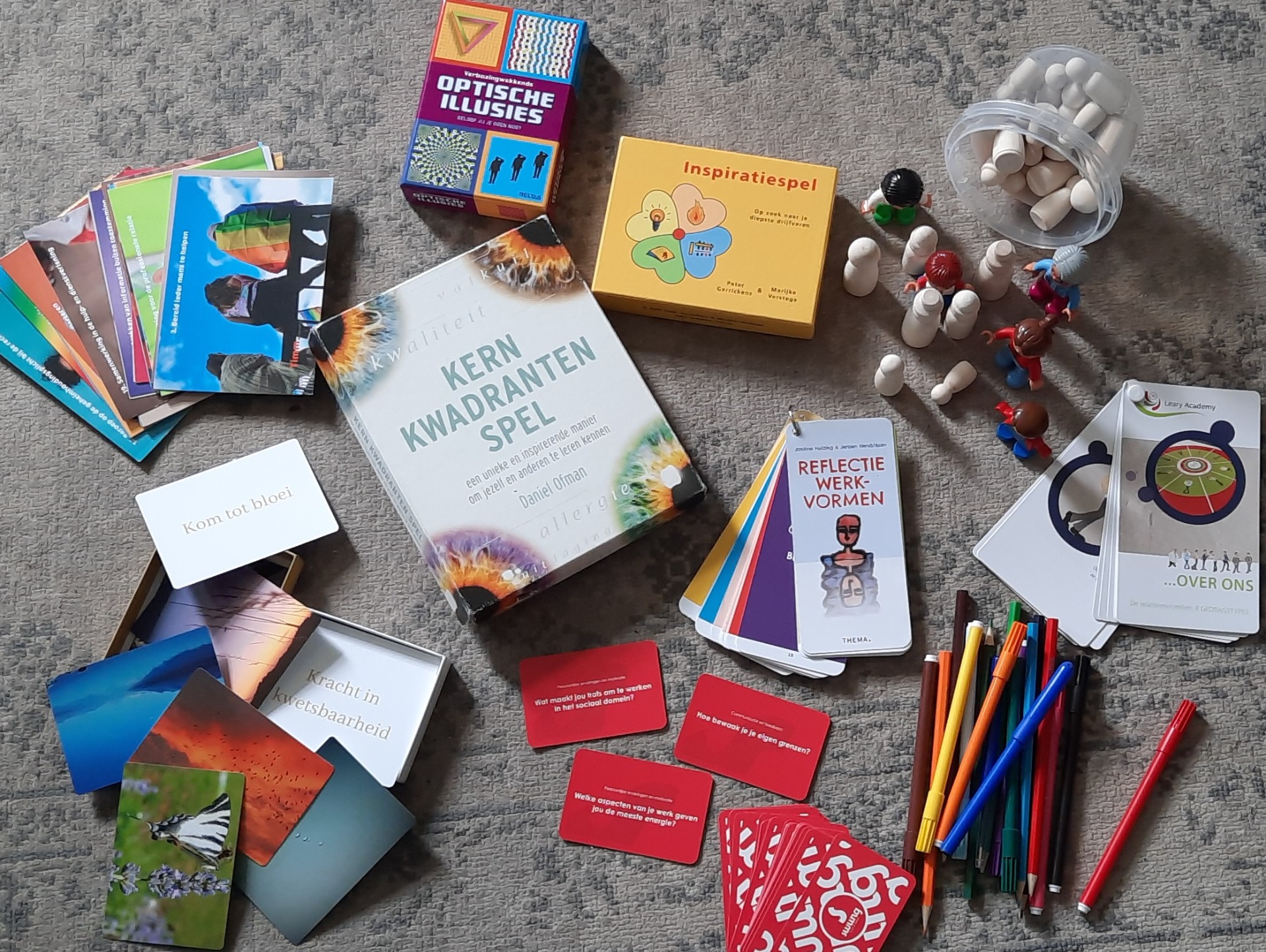 Om het afstemmen te verdiepen, werk ik veel met beeldende en creatieve werkvormen. Denk bijvoorbeeld aan het neerzetten van houten figuren of LEGO-poppetjes om verschillende innerlijke stemmen zichtbaar te maken. Ook maak ik gebruik van visuele hulpmiddelen zoals papier en stiften, fotokaarten en vloerankers. Je doet in het hier en nu ervaring op met deze werkvormen: door te tekenen, schrijven en visualiseren veranker je nieuwe inzichten en zet je meteen een stap in je ontwikkeling. Creatieve werkvormen helpen om het niet-zichtbare zichtbaar te maken, mits afgestemd op de leerfase van degene die begeleid wordt (Boer et al., 2015). Ze faciliteren reflectie op diepere lagen van identiteit, stimuleren de integratie van hoofd, hart en handen, en openen nieuwe invalshoeken voor ontwikkeling. Een doos met poppetjes, tekenpapier en stiften, kaarten zul je altijd op mijn bureau of in mijn tas vinden.