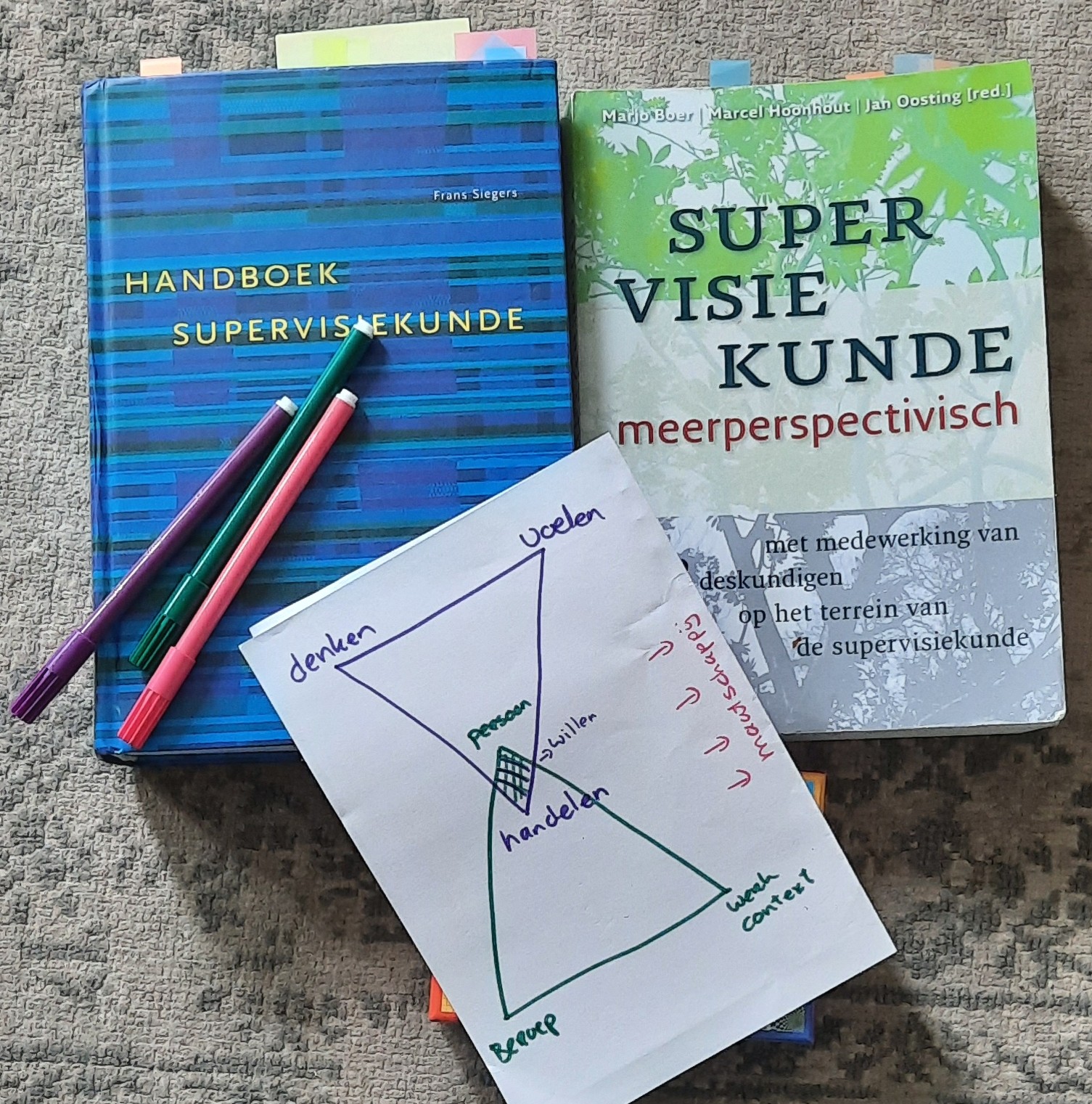 Om dat te verdiepen maak ik gebruik van verschillende werkvormen, methodieken en theoretische kaders. Beeldende en creatieve werkvormen zoals het neerzetten van figuren, tekenen, schrijven en visualiseren maken het onzichtbare zichtbaar en helpen nieuwe inzichten te verankeren. Tegelijkertijd werken we met modellen en reflectietools die denken, voelen en handelen verbinden, zoals de integratiedriehoek van Siegers en de logische niveaus van Bateson.